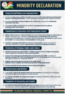 اقلیتی اعلامیہ میں SETWIN کے ذریعہ بیروزگار نوجوانوں کو ہنرمند بنایا جائے گا۔ پرانے شہر میں بنیادی ڈھانچے کی ترقی کے لیے قلی قطب شاہ اربن ڈیولپمنٹ اتھارٹی کو اختیار دینے کا وعدہ۔ اعلامیہ میں کہا گیا ہے کہ اقلیتوں کے نئے شادی شدہ جوڑوں کو 1,60,000 روپے کی امداد دی جائے گی۔