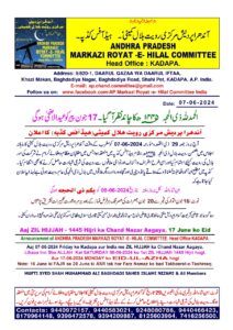 لہٰذا تحت ا حکام شرعیہ مرکزی رویت ہلال کمیٹی صدر مجلس علماء دکن اعلان کرتی ہے کہ کل بروز ہفتہ 8 جون کو یکم ذی الحجہ ہوگی۔ اسی طرح 17 جون کو عیدالاضحیٰ منائی جائے گی۔