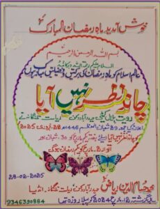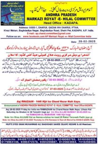 مرکزی رویت ہلال کمیٹی صدر مجلس علماء دکن کا ماہانہ اجلاس بضمن رویت ہلال ماہ رمضان المبارک 1446 زیر نگرانی حضرت مولانا سید حسن ابراھیم حسینی قادری سجاد پاشاہ معتمد صدر مجلس علماء دکن آج بعد نماز مغرب حسینی بلڈنگ معظم جاہی مارکٹ میں منعقد ہوا۔ چاند نظر نہ آنے کی اطلاع ملی ہے، لہذا تحت احکام شرعیہ صدر مجلس علماء دکن مرکزی رویت ہلال کمیٹی اعلان کرتی ہے کہ 2 مارچ بروز اتوار یکم رمضان المبارک ہوگی۔