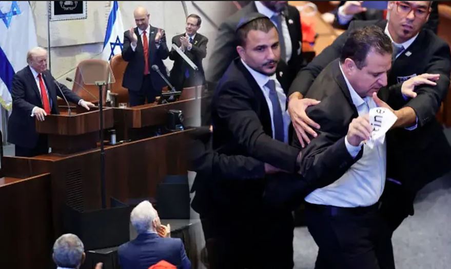 اسرائیلی پارلیمنٹ (کنیسٹ) میں امریکی صدر ڈونلڈ ٹرمپ کے خطاب کے دوران اسرائیلی ارکانِ پارلیمنٹ نے فلسطین کے حق میں احتجاج کیا، جس پر سیکیورٹی اہلکاروں نے انہیں ایوان سے باہر نکال دیا۔ احتجاج کی ویڈیو سوشل میڈیا پر وائرل ہو گئی ہے۔