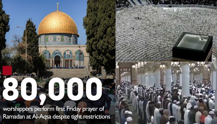 رمضان کے پہلے جمعہ پر مسجد اقصیٰ میں سخت پابندیوں کے سایہ میں ہزاروں فرزندانِ توحید نے ادا کی نماز جمعہ، حرمین شریفین اور مقدس مساجد میں روح پرور اجتماع