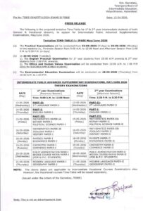 حیدرآباد (دکن فائلز) تلنگانہ بورڈ آف انٹرمیڈیٹ ایجوکیشن نے انٹرمیڈیٹ ایڈوانسڈ سپلیمنٹری امتحانات 2026 کا مکمل شیڈول جاری کر دیا ہے۔ طلبا 13 اپریل سے 20 اپریل تک فیس جمع کرا کے امتحانات کے لیے درخواست دے سکتے ہیں۔