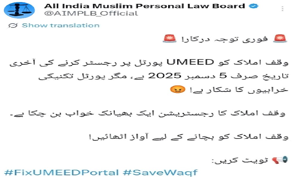 حیدرآباد (دکن فائلز) آل انڈیا مسلم پرسنل لا بورڈ نے چہارشنبہ کو وزیر مملکت برائے اقلیت امور، جارج کیریان سے فوری اور ہنگامی ملاقات کےلئے وقت طلب کرتے ہوئے امید پورٹل پر بار بار پیش آنے والی تکنیکی خرابیاں دور مزید پڑھیں