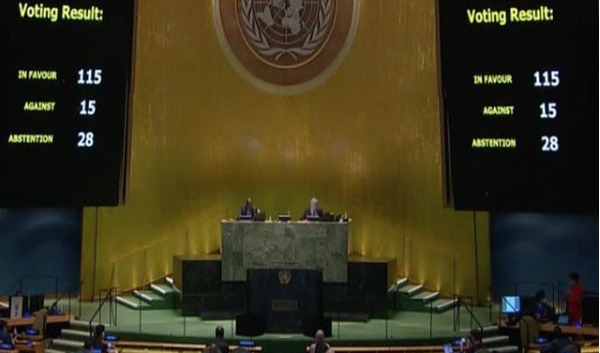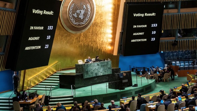 اقوام متحدہ کی جنرل اسمبلی نے غزہ میں انسانی بنیادوں پر فوری جنگ بندی سے متعلق غیر واجب العمل (Non binding) قرارداد منظور کر لی۔ اقوام متحدہ کی جنرل اسمبلی کے 193 رکنی پارلیمان میں 153 ارکان نے قرارداد کے مزید پڑھیں